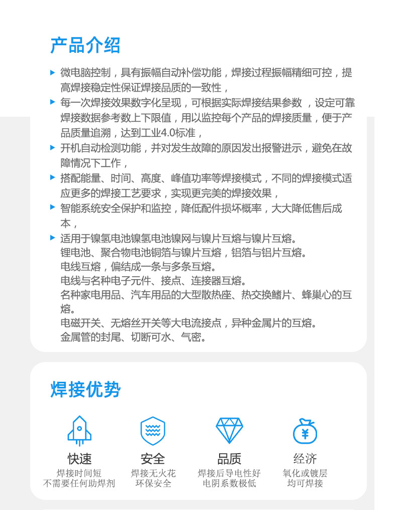 铭扬超声波金属焊接机能对铜、银、铬镍等可导电金属的细薄材料实施点状、条状焊接,可广泛应用于可控硅芯片引线、快速熔断器熔体熔座、电器引线终端、锂离子、镍氢、镍镉电池极片极耳等的点状、条状焊接。