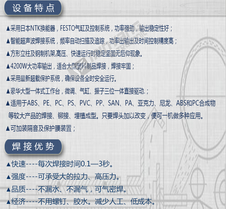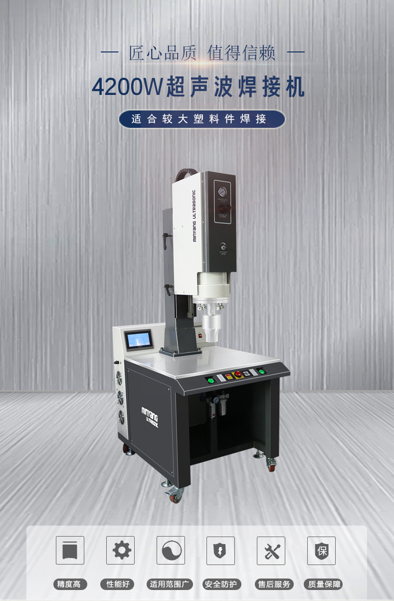铭扬4200W大功率超声波焊接机适用于:晒鼓、墨盒、汽车仪表盘、前车灯、后灯灯、汽车仪表盘,保检杠、前后门,灯具、刹车灯、汽车滤清器手机、电子产品,汽车仪表盘、电器、汽车配件、包装、环保、医疗器械、无纺布、玩具、通信器材、遙控车船、塑胶玩偶、玩具槍、水枪、遊乐器 等较大产品焊接
