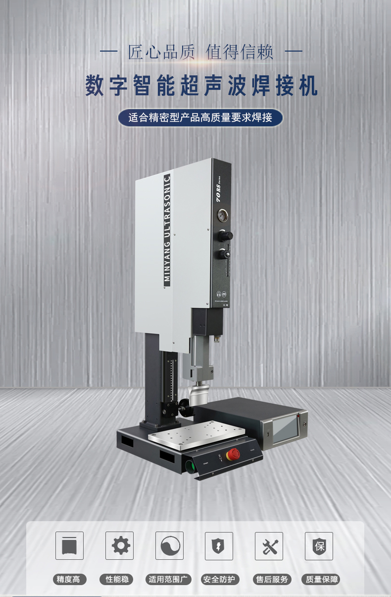 铭扬新款35KHZ数字智超声波焊接机是集合超音波数位发生器、控制器、压床与一体的全新系列,可适用与客户的常规熔接需求。具有多种焊接模式,能符合客户更严苛的焊接要求,熔接强度能接近于原材料强度。 对熔接较软的PE、PP材料,以及精密型、熔接要求高的塑胶熔件,具有独特的效果,能满足各种产品的需要。